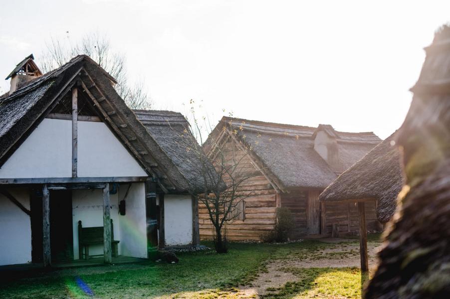 Vorbei und hinein in diverse Hütten, Backhaus und Hügelgrab,…